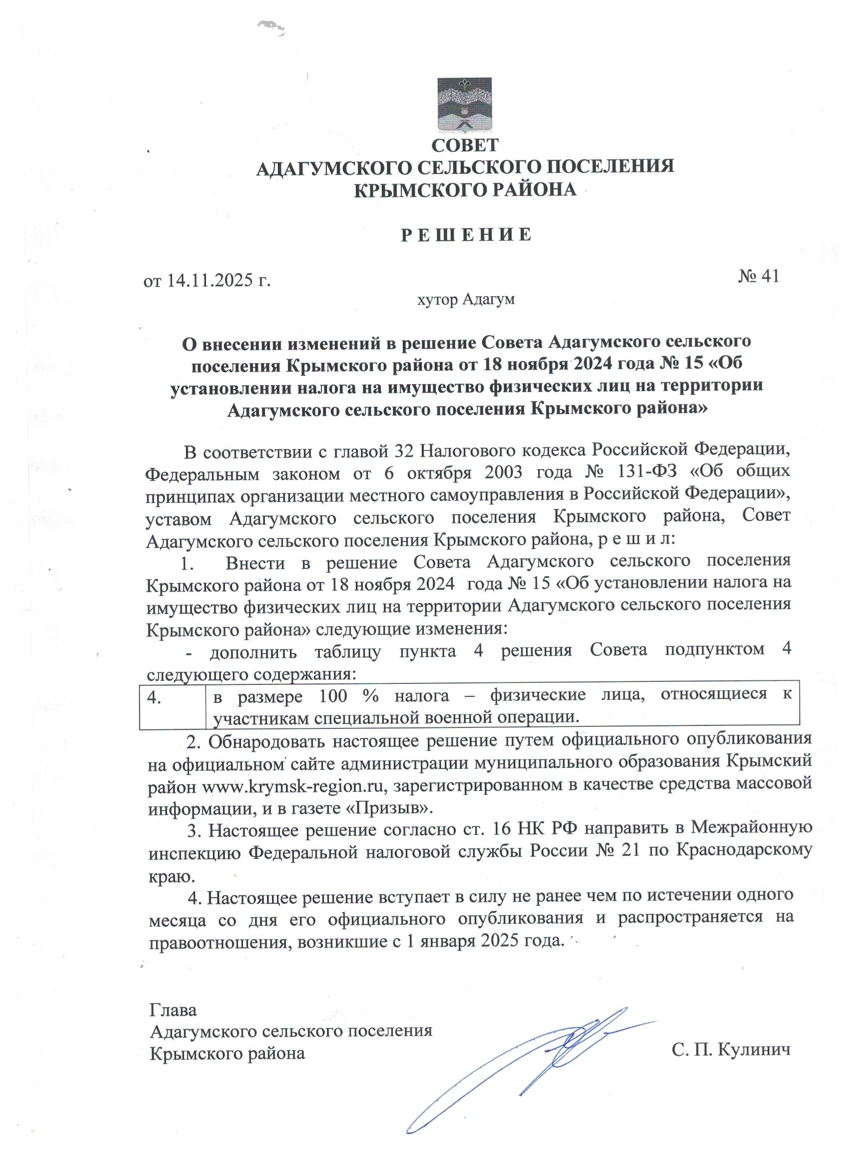 | 23 | 07.04.2025 | Решение Совета Крымского городского поселения Крымского района | 27.03.2025 | 62 |